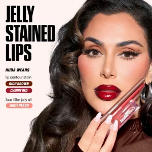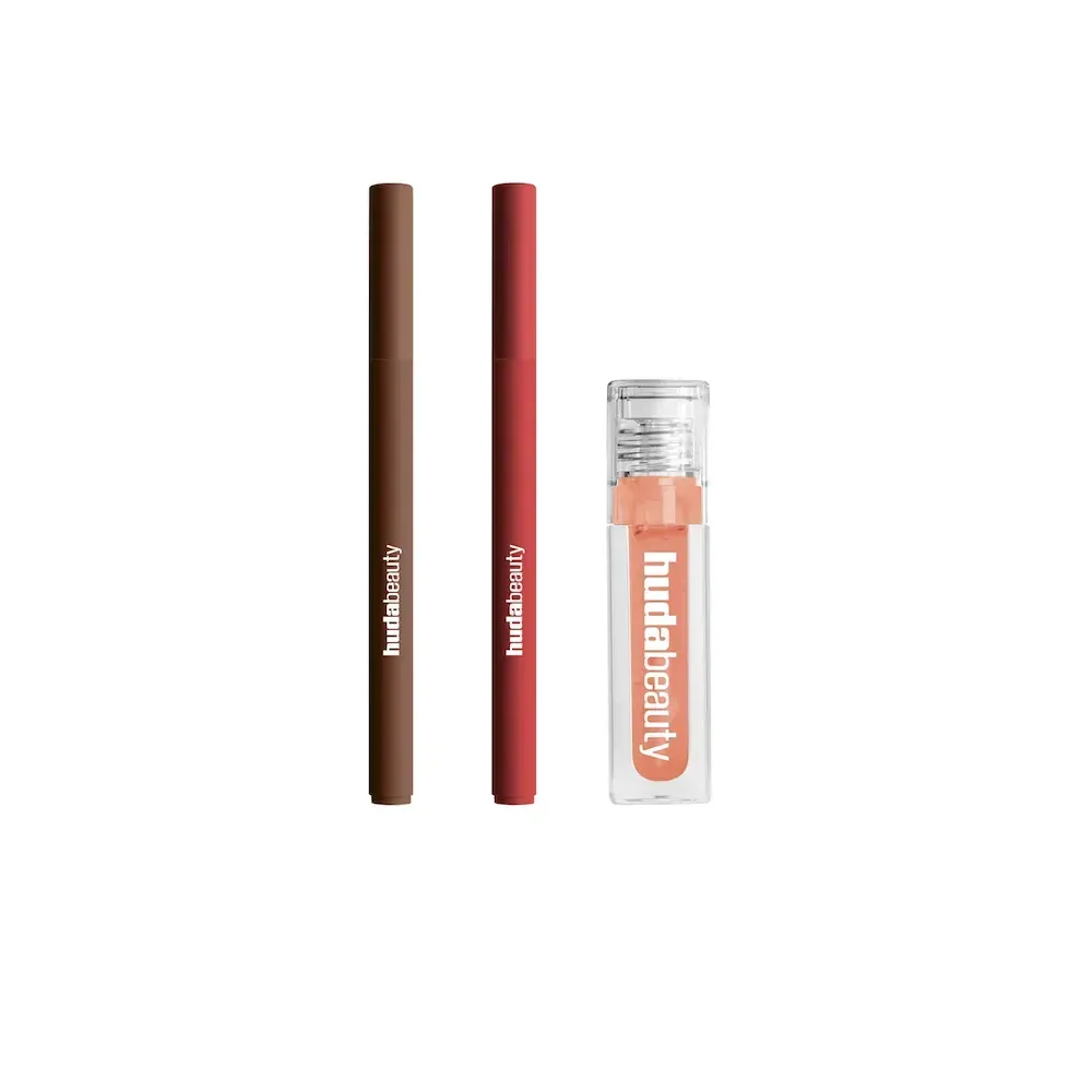 A bundle of two full size shades of Lip Contour Stain (Rich Brown + Cherry Red) and one full size shade of Faux Filler Jelly Oil (Peach).