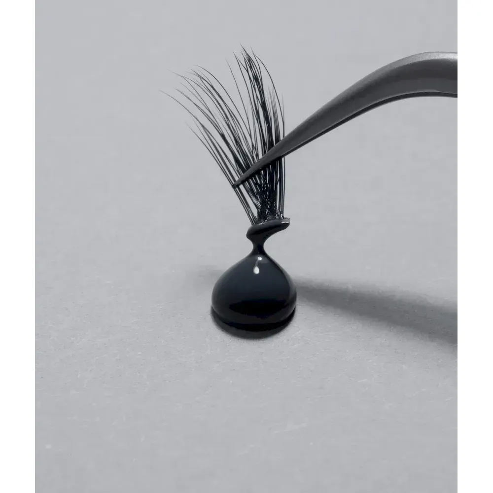 - Using tweezers, tap the base of the lash cluster into the glue, then apply the lash along your lash line